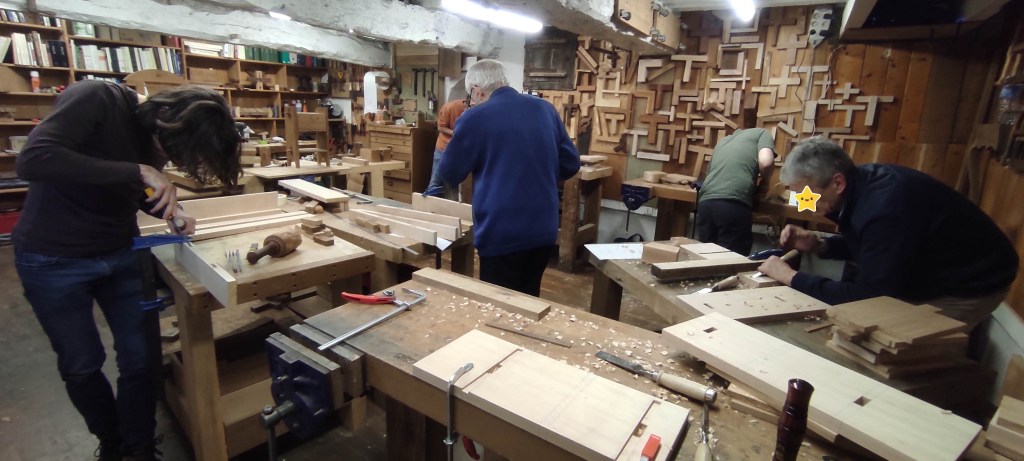 Stages en atelier.L’atelier ou est effectué le stage.Réalisation d’une petite table basse assemblée en mortaises et tenons avec uniquement des outils à main en deux jours.Réalisation d’une étagère de style orientale en tenons et mortaises uniquement avec de l’outillage à main.Le résultat le meuble fini, en attente de traitement.Création artistique réalisée en une journée, assemblages en enfourchement et le chat a été réalisé à l’aide d’une scie à chantourner et diverses essences de bois. Finition réalisée afin d’apporter une tinte à l’aide d’huile de lin clarifiée et de pigments.Deux autres réalisations d’élèves à gauche et mon œuvre à droite ^_^ Pigments utilisés pour la tinte de finition mélangés avec de l’huile de lin clarifiée.Stage pour la réalisation d’une table de nuitRéalisation d’un tiroir avec queues d’aronde pour la table de nuit.Réalisation de rainures pour intégrer les étagère dans la table de nuit.La table de nuit terminée prête à vernir. Réalisation d’une petite table basse avec divers assemblages, tenons et mortaises, chevauchements, queues d’arondes.Deux journées de stage d’affutage, le premier jours pour les ciseaux à bois et le second jour pour les rabots et les scies.Réalisation d’un plan à échelle 1/10 d’un meuble confiturier.Réalisation d’un plan à l’échelle 1 avec superposition des vues de face en jaune, du dessus en rouge et de côté en bleu.Sculptures en bois issue de bois trouvé en bord de plage (bois flotté). Sculptures en cours d’élaboration.Confection de petites poches en tissu servant à accueillir les bijoux réalisés.Réalisation d’un établi à partir de bois recyclés.Projet d’aménagement et d’équipement de VanRéalisation d’une banquette lit-peigne pour l’aménagement de mon camion.Banquette dépliée.Pose de paumelles afin de permettre l’accès au coffre.Isolation du camion avec de l’isolant Armaflex multicouche. Habillage des panneaux avec moquette. Réalisation d’un plancher. Installation électrique avec batterie auxiliaire. Pose d’éclairages et de deux embases pivotantes sur le siège conducteur et sur la banquette avec en plus un système de rabattage des dossiers.Placage bois et fabrication d’un meuble cuisine avec rangements, alimentation en eau, courant électrique et évacuation d’eau.Placages bois pour installation de rangements.Réalisation des rangements.Préparation des jantes pour peinture.Résultat après peinture des jantes et des pare-chocs et avec la pose d’éléments de protection de la carrosserie.Résultat après peinture des jantes et des pare-chocs et avec la pose d’éléments de protection de la carrosserie et d’antibrouillard avant.Installation d’un panneau solaireInstallation d’une batterie relais à gel de 160 Ampères avec double alimentation sur panneau solaire avec boitier régulateur ainsi qu’un coupleur/séparateur connecté à l’alternateur assurent l’alimentation de l’installation. Un coupe circuit et un tableau électrique avec fusibles ont été installés pour sécuriser l’ensemble de l’installation. Réalisation d’un bureau sur mesure.Réalisation d’une table basse avec fabrication d’un châssis métallique tubulaire et de volutes décoratives. Le plateau est une base de contreplaquée 18mm avec un habillage réalisé à partir de chutes de parquet en merbau.Réalisation d’un meuble pour l’aménagement d’un camping car.Le bois pour la fabrication est issu de bois de récupération.Pose d’une cuisine avec réalisation d’un plan de travail en chêne.Pose d’un meuble avec plan de travail.Réalisation d’une penderie en OSB.Réalisation d’une fleur de vie.Réalisation d’un Triskel
